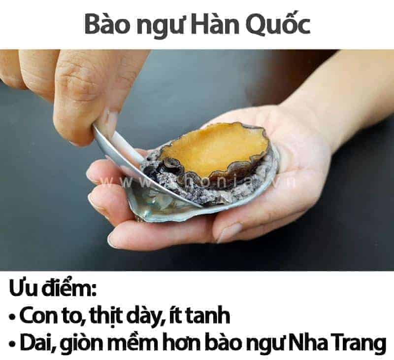 Bào ngư Hàn Quốc thì giá thành cao hơn Nha Trang một chút. Nhưng ưu điểm là con to thịt nhiều, thịt dai dai, giòn giòn, ít tanh ngon hơn bào ngư Nha Trang của Việt Nam mình.