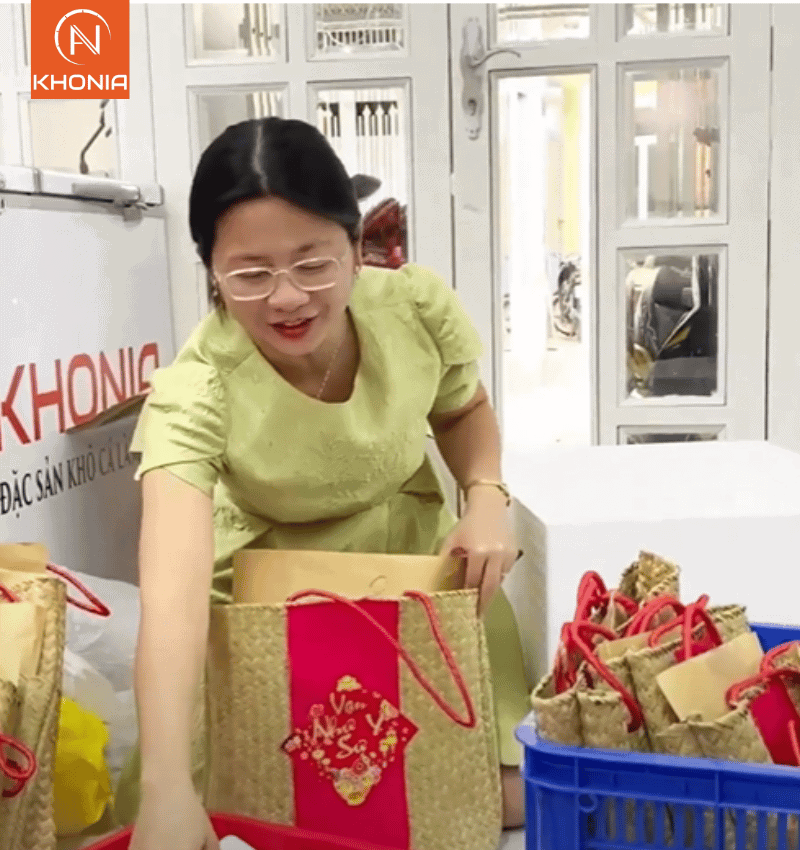 Mỗi giỏ quà Tết anh lấy là gồm lạp xưởng, khô cá lóc đồng, khô cá sặc. Mỗi giỏ quà Tết thì Út Loan đóng túi giấy, rồi mới bỏ vào giỏ quà nên rất gọn nha.