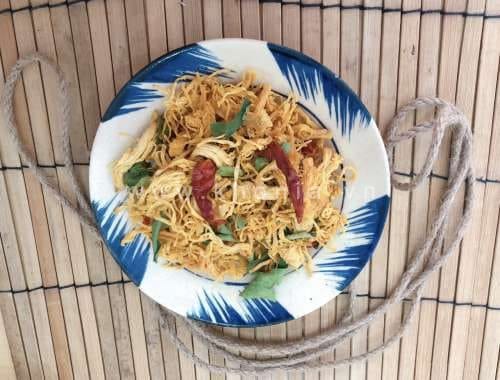 Khô gà lá chanh vị ướp gia vị cay cay, ngọt ngọt mặn mặn vừa ăn cũng vị thơm lừng của lá chanh ăn lại càng ghiền.